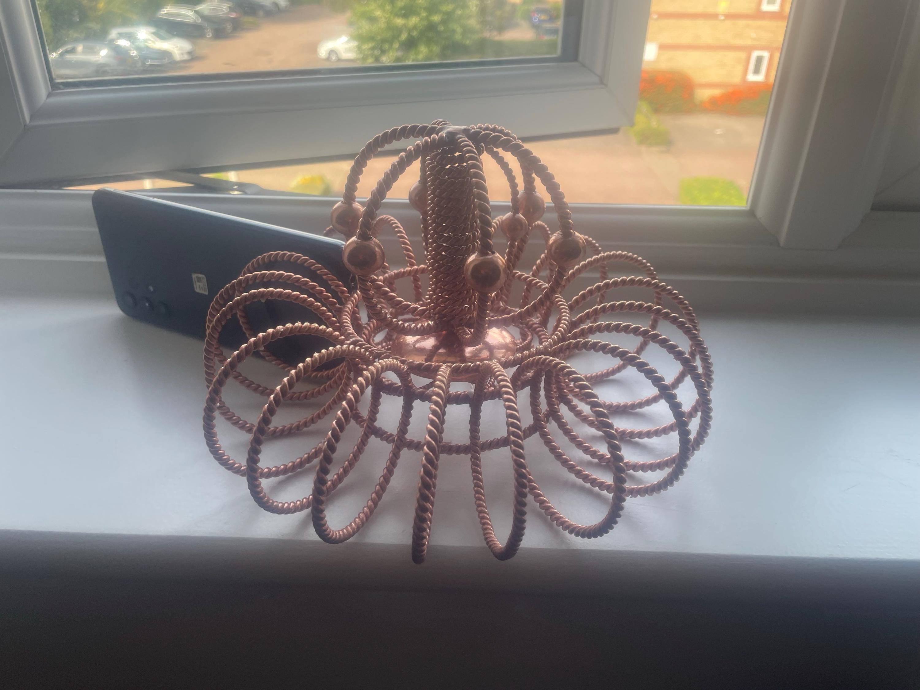 A striking handcrafted Copper Torus Harmoniser, combining three traditional Tensor frequencies — 144 MHz, 177 MHz, and 432 MHz — in one elegant design. Each piece is carefully cut, measured, and welded by hand following sacred geometry principles, creating a unique decorative and spiritual statement piece.