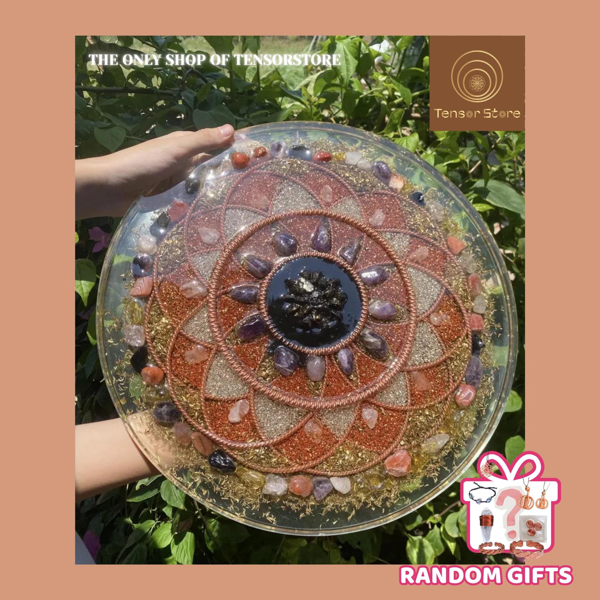 This Large Orgonite Charging Plate (36 cm diameter) is a handcrafted work of sacred geometry art, combining 99.99% pure red copper coils, natural crystals, and three traditional Tensor frequencies — 144 MHz, 177 MHz, and 432 MHz