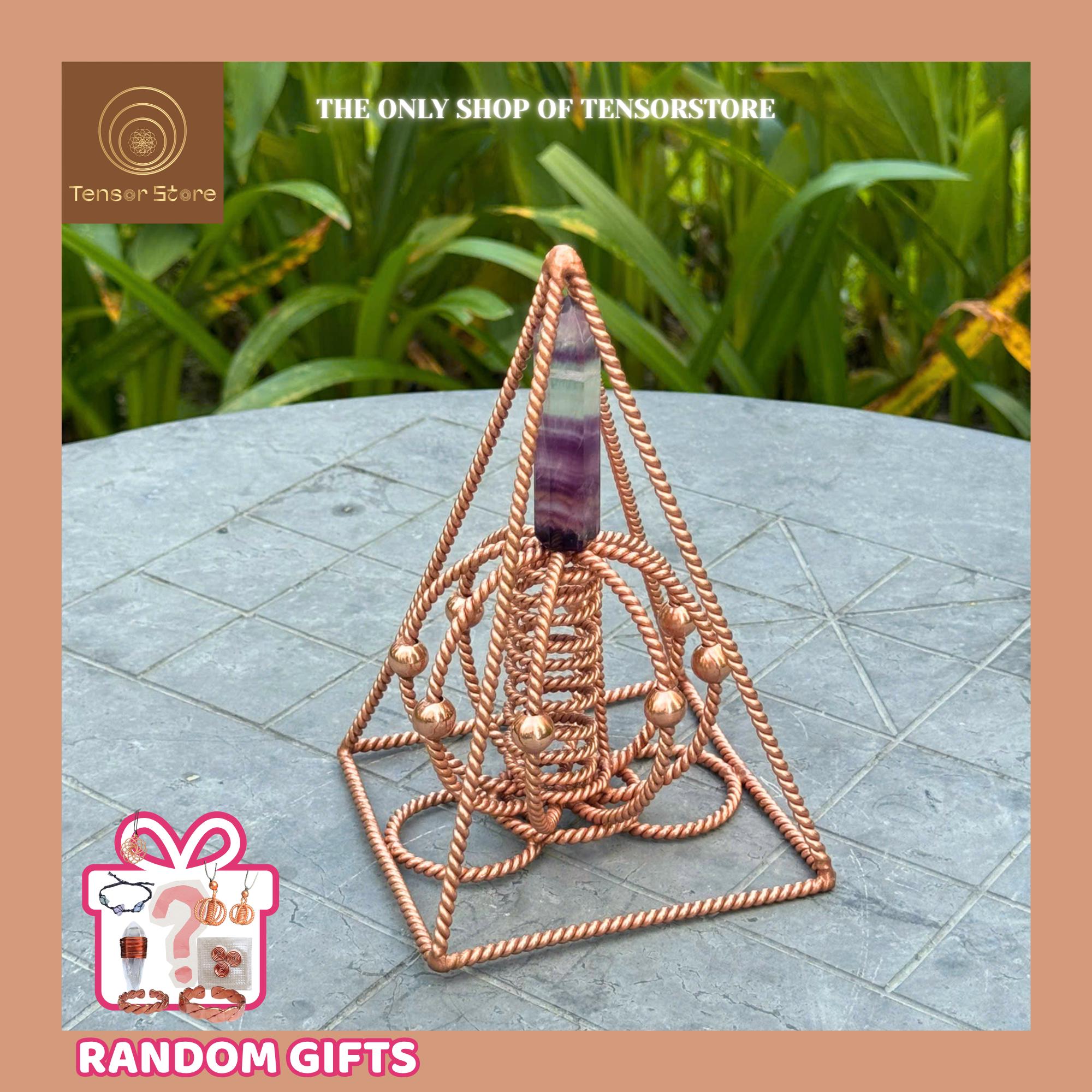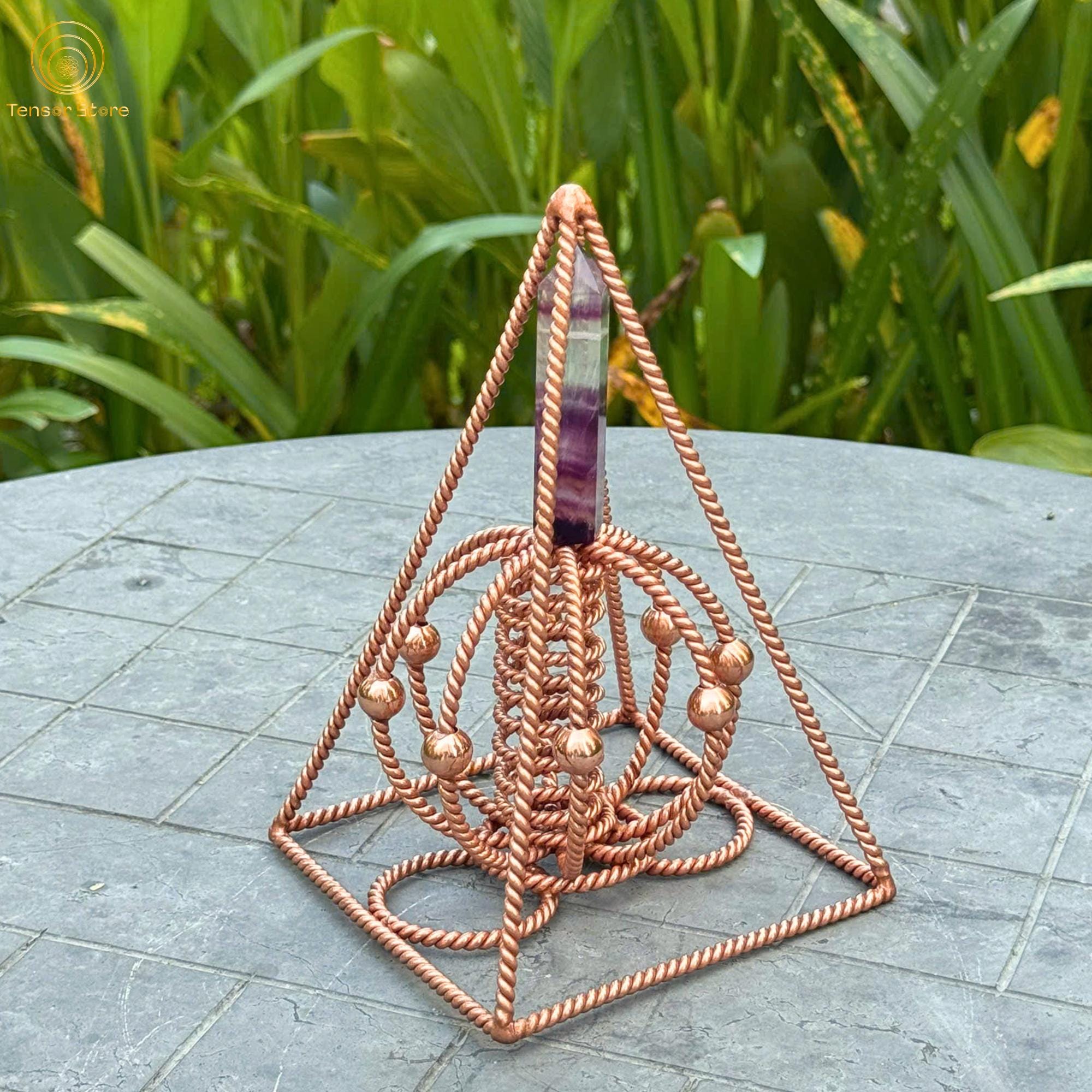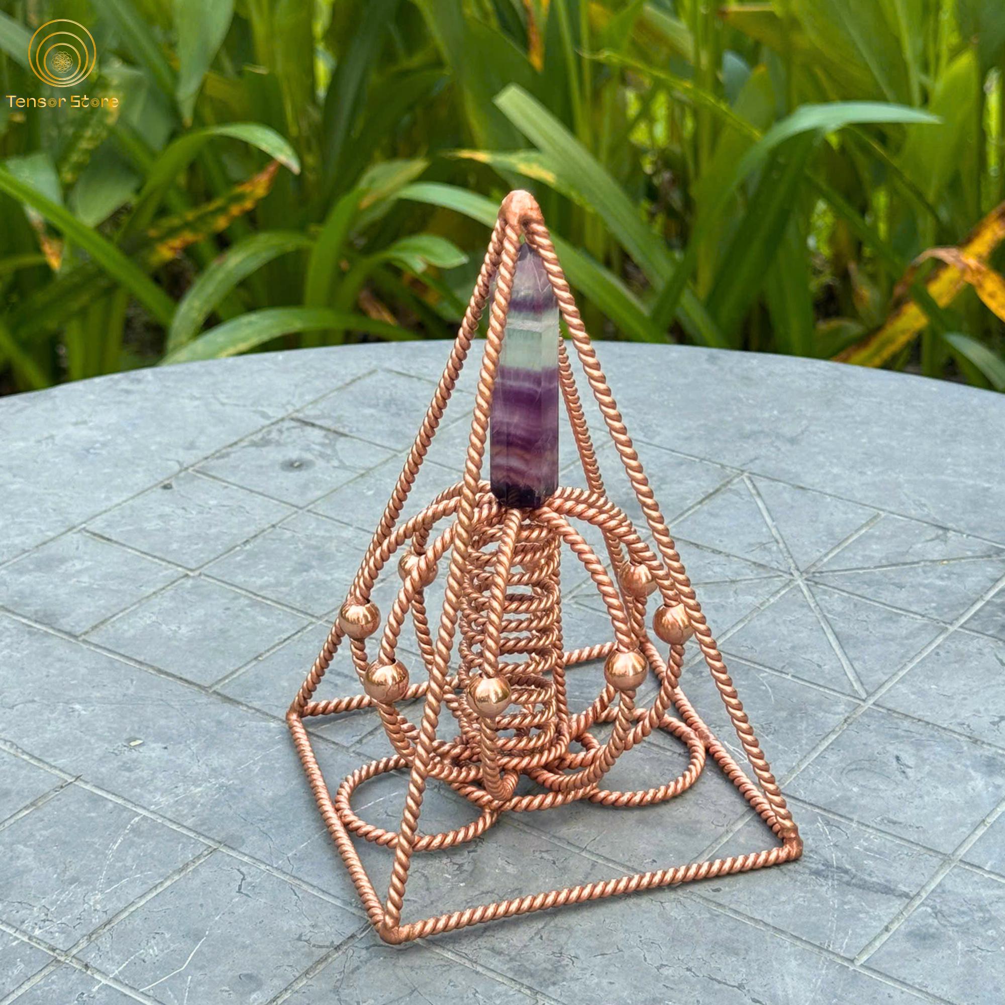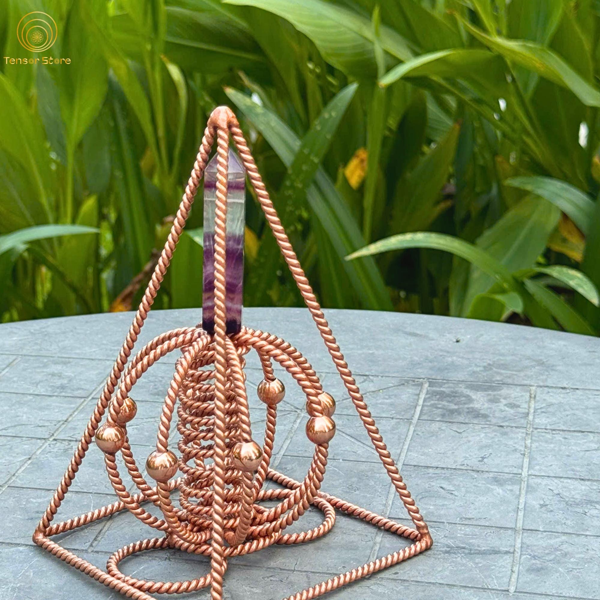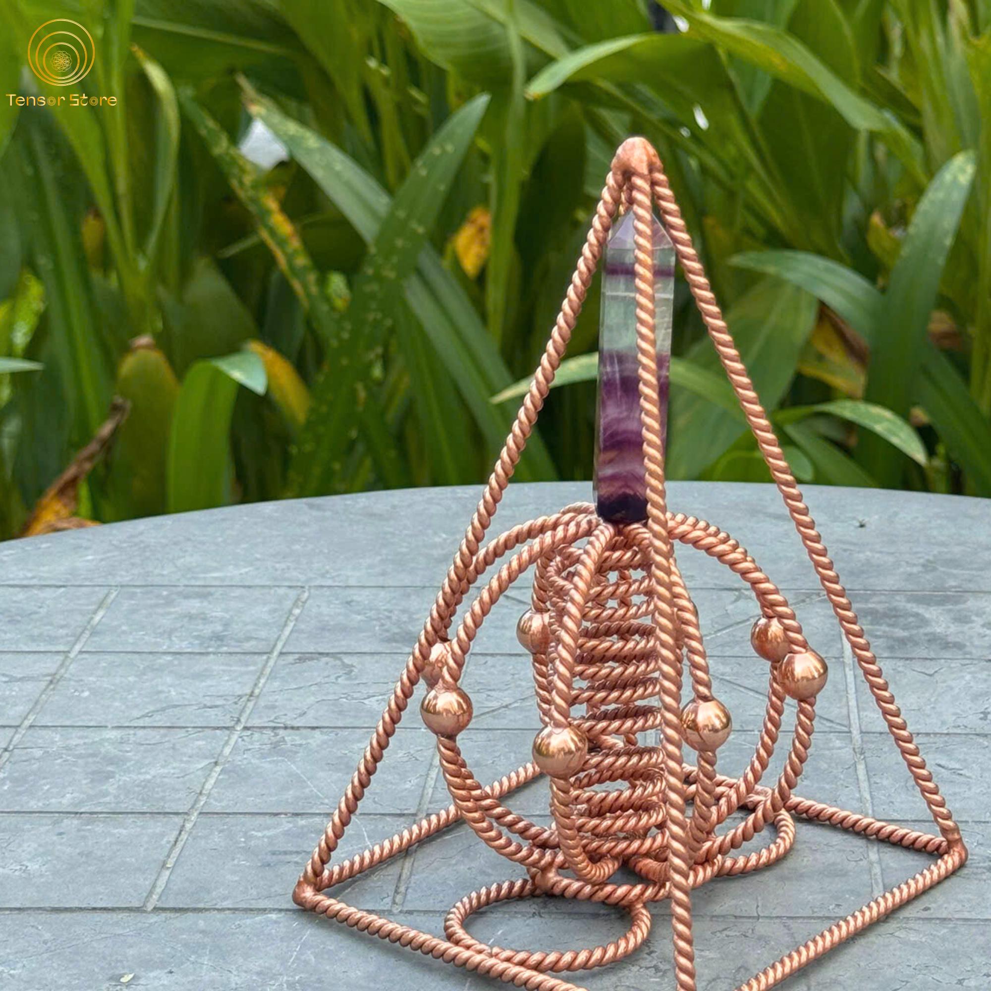 This handcrafted Nubian Red Copper Pyramid features an Amethyst crystal point beautifully integrated with the 144 MHz and 177 MHz Tensor Frequencies, forming a dual-frequency geometric design that symbolizes harmony, clarity, and balance.