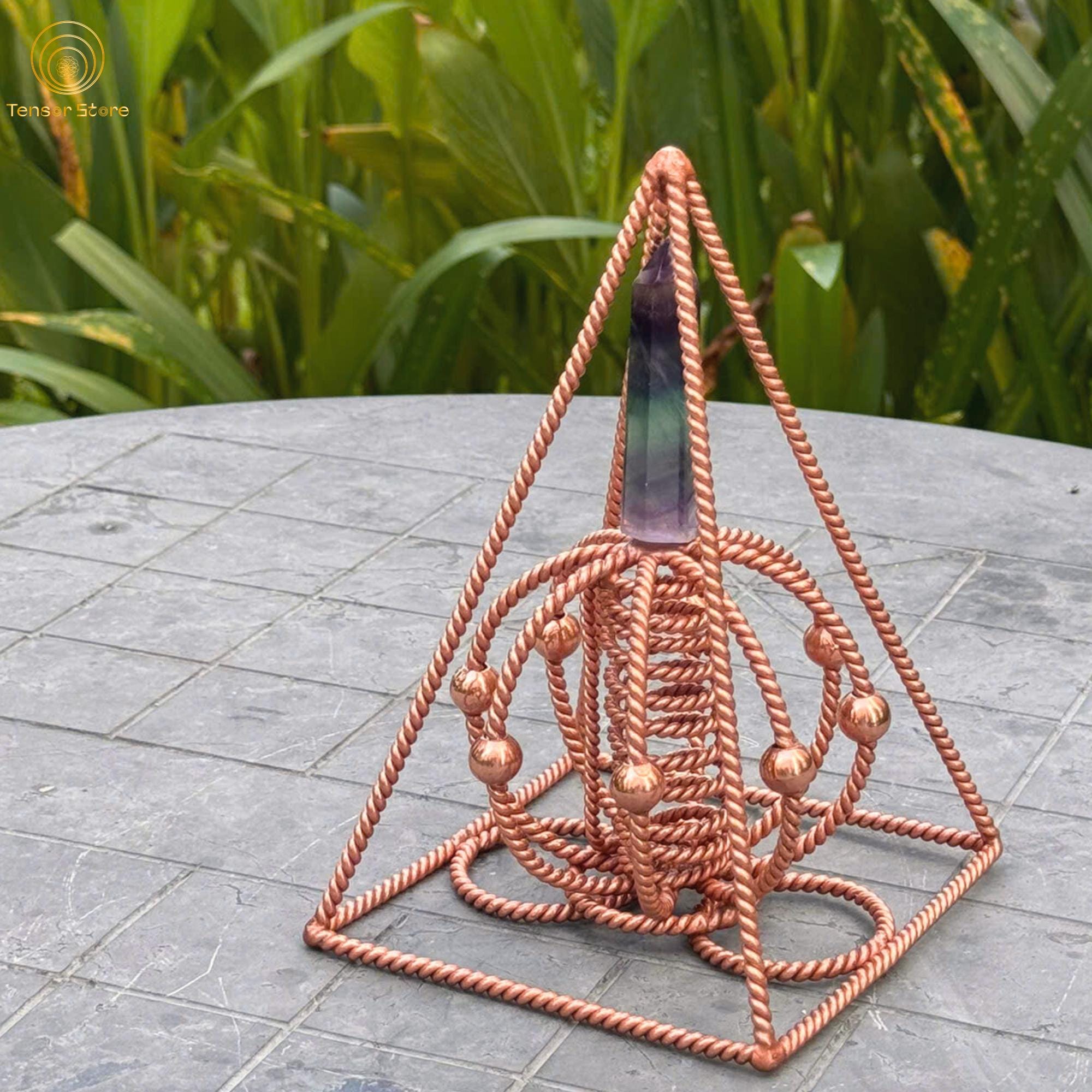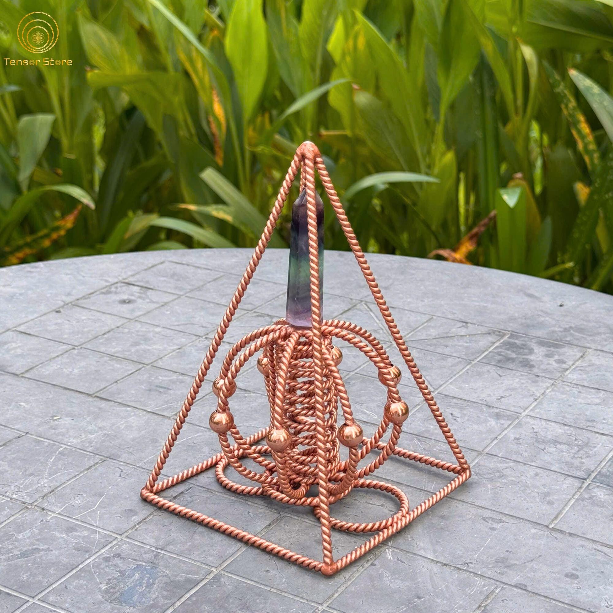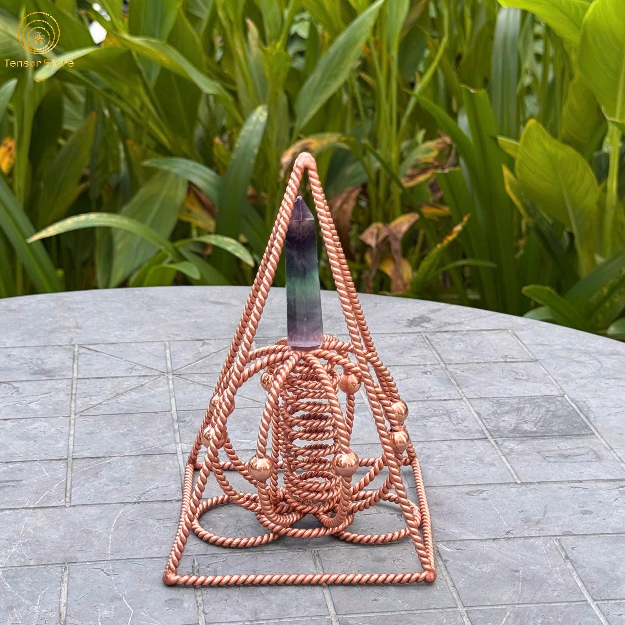 Built with a 12 cm base and sides measuring approximately 19 cm, this pyramid is made from 99.99% pure red copper, carefully hand-twisted and welded in alignment with sacred geometry proportions.