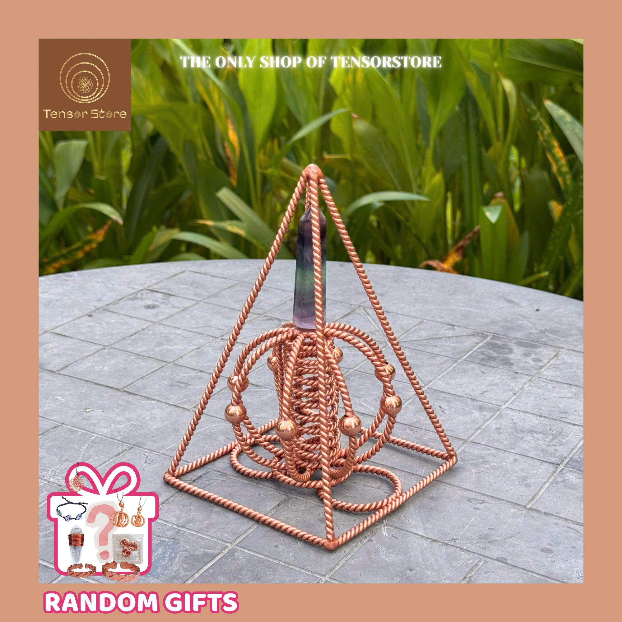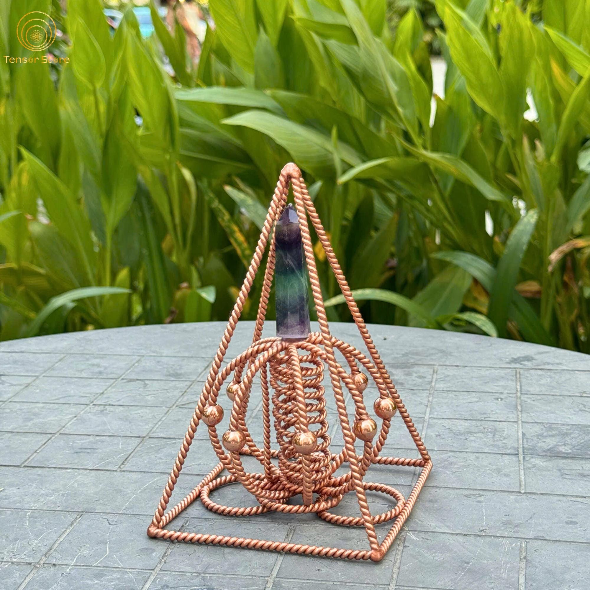 This handcrafted Nubian Red Copper Pyramid features a Fluorite crystal point integrated with 144 MHz and 177 MHz Tensor Frequencies, forming a visually striking piece of sacred geometry art that represents balance, clarity, and energetic harmony.